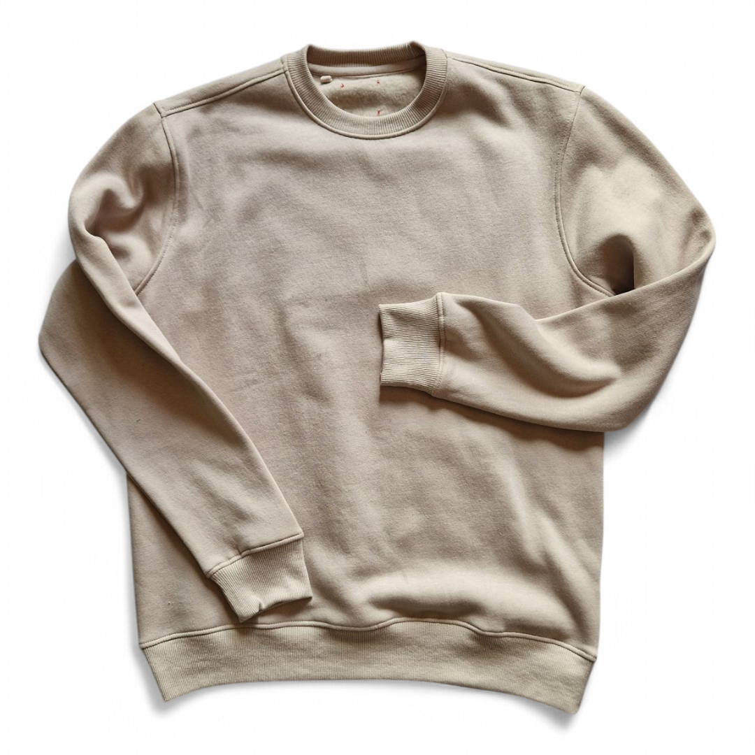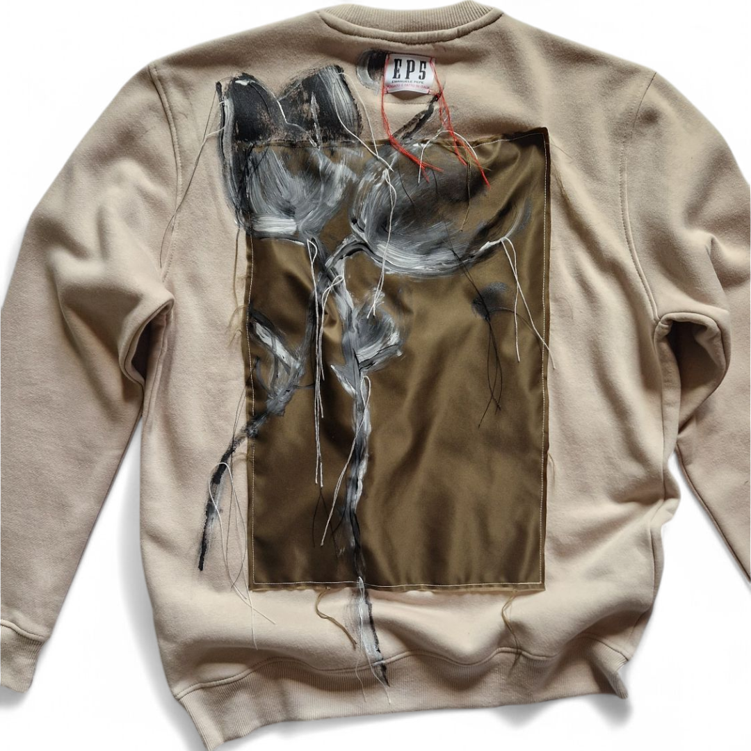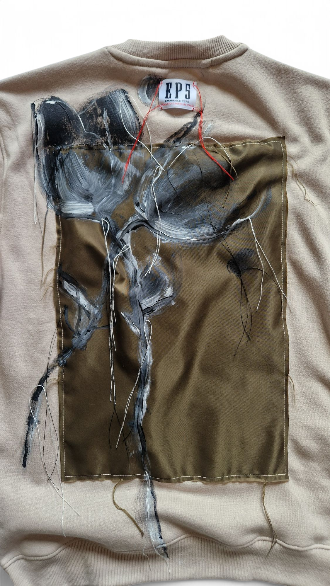 Felpa beige con pannello in nylon verde sulla schiena dipinta a mano con ricami filo sciolto